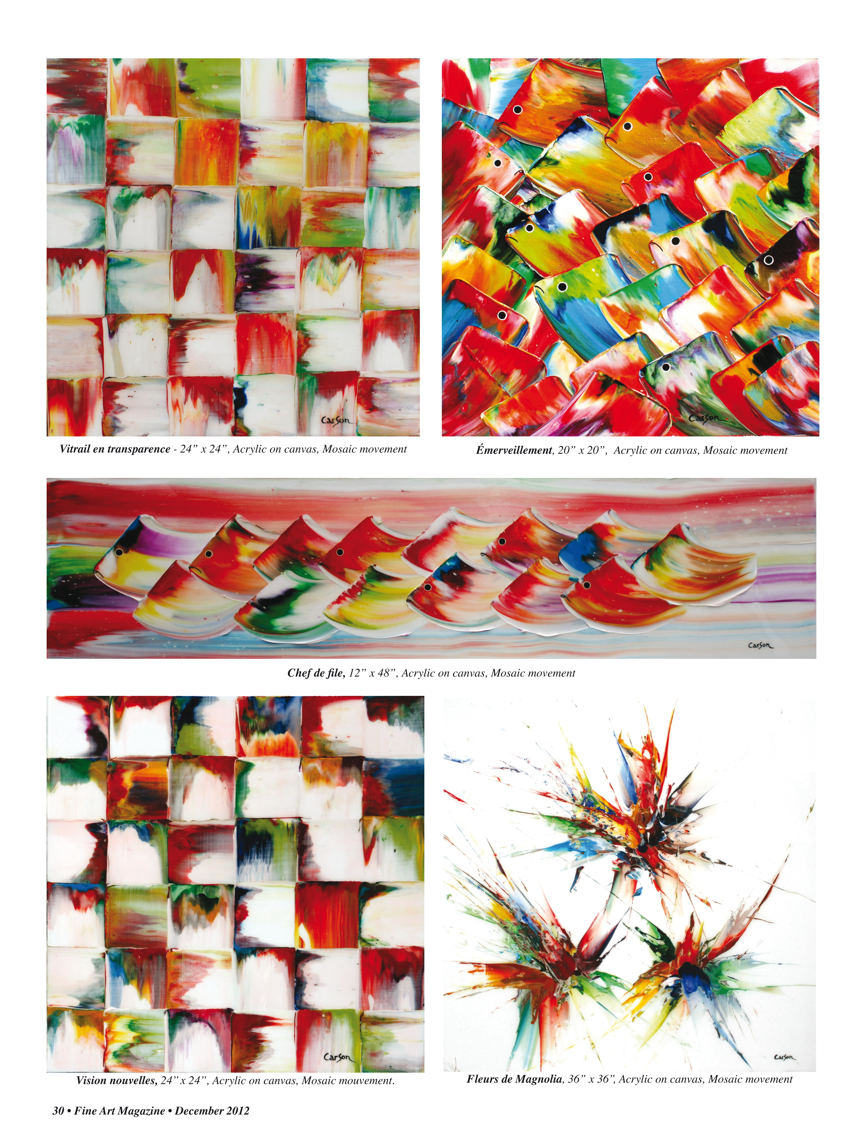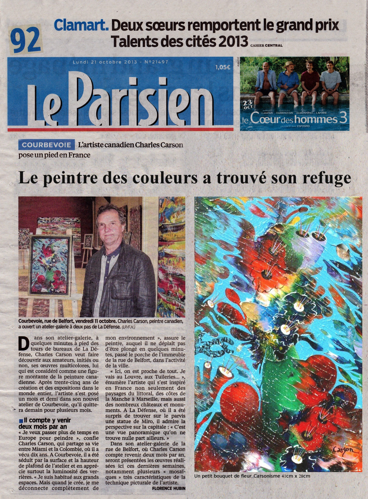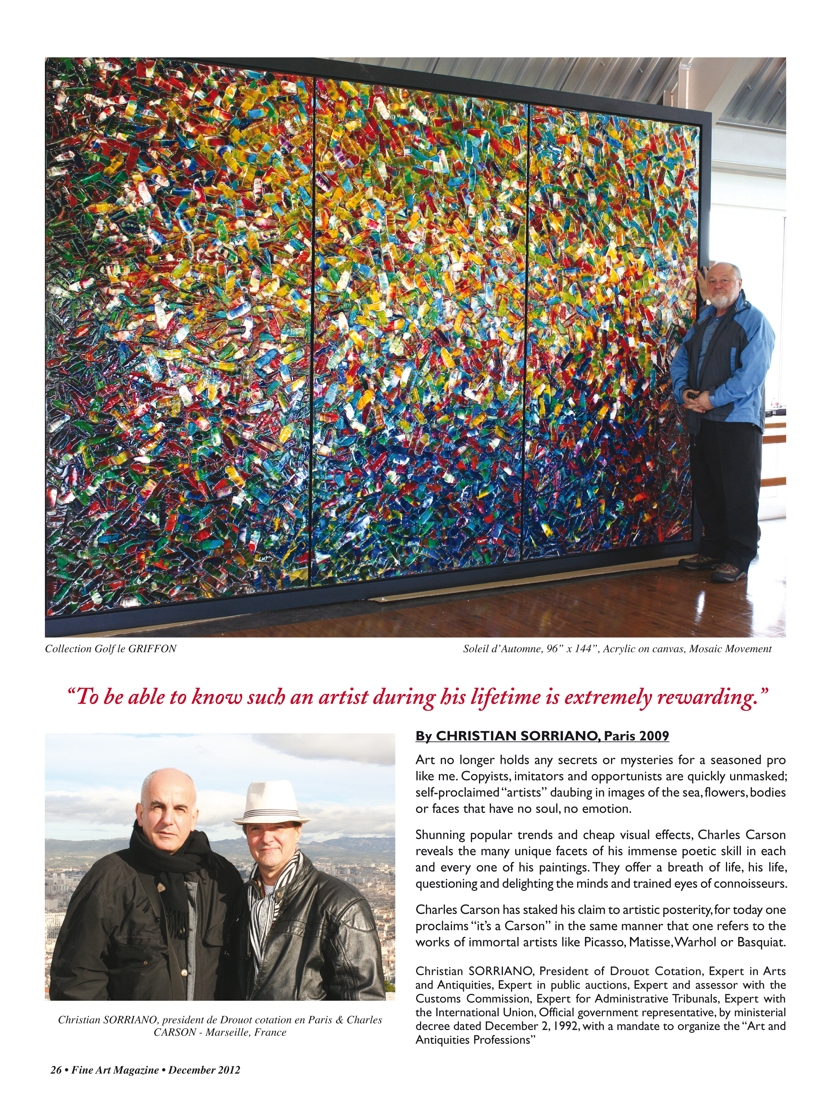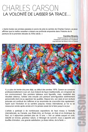 ARABELLA magazine, Canada, USA, édition, 2013 Un Jewel Brilliant » Debra Usher «L’artiste canadien Charles Carson est reconnu sur la scène artistique internationale comme le père du « Carsonisme »- un terme désignant ses créations singulières et profonde, pleine de couleur et de vivacité. Il a passé les 35 dernières années à peindre des toiles à couper le souffle, des images qui donnent à réfléchir, alimentée par une passion pour les régions tropicales de l’Amérique latine, lâ où il vécu près de 10 ans et a beaucoup voyagé. Son langage pictural unique rend son œuvre très prisé à collectionner. Son nouveau défi pour les trois prochaines années – la création de murales et de pièces majeure de musée pour les marchés de l’Europe et du Moyen Orient. » « Presque dès le début, il était entendu que Charles Carson serait un succès …. » « …Ses coups de pinceau sur la toile s’apparentent à la flambée des notes trouvées dans les meilleurs solos de saxophone alto. Peut-on oser dire David Sanborn et John Coltrane sont dans le même souffle que Charles Carson? L’histoire décidera, mais en son temps Carson donne une pointe vibrante pour le mystère incomparable et unique de la vie – qui se reflète dans ses oeuvres. » «… Charles Carson a adopté son propre mode d’expression avec la passion d’un maître, mais il possède aussi le nerf d’un aventurier et l’intelligence d’un historien …» «…Aujourd’hui, Carson a acquis une reconnaissance au niveau international et reconnus par de nombreux historiens et experts en arts pour son style unique « Carsonisme ». «…Il est tout simplement impossible d’ignorer un artiste qui a découvert de nouvelles valeurs de l’art, manière qui remet en cause toutes les tendances, des genres ou styles qui dominent le marché de l’art traditionnelle contemporain d’aujourd’hui. Charles Carson à la capacité d’imaginer, interpréter et transposer sa vision unique du monde autour de lui avec force et subtilité. « Il est considéré par la critique comme l’un des plus grands artistes contemporains de ce siècle, Maître Carson ayant saisie le langage picturale parlé autrefois par Mondrian, Riopelle, Jackson Pollock, Sam Francis et Wassily Kandinsky, l’artiste a su prendre les devants – Car la création et la mise à jour de son mouvement tout à fait unique et original, interprété d’une tel façon théâtral et magistral, qu’aucun de ces grands maître ou génies de l’art des temps passé, n’avais su imaginé ou même pensé jusqu’à présent. » « Ces figures légendaires ont accompli des exploits extraordinaires, mais aucun n’a créé d’une manière si unique, si personnel son style, qu’il ne pouvait-être définie par un isme. Carson, par son unicité inégalé, un nouveau mouvement est né. Le « Carsonisme ». Source : ARABELLA magazine, Canada, USA, édition, 2013