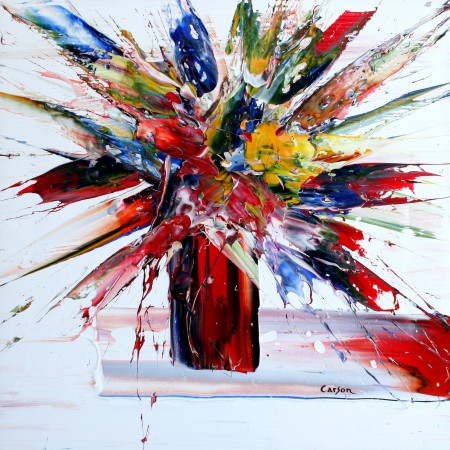 Contrairement à ce que l’on pourrait croire, le Carsonisme se distingue des œuvres de Riopelle. La recherche de Charles Carson est axée sur la juxtaposition et la superposition des couleurs qu’il peint avec grande spontanéité, sans idée de départ, mû par l’instinct créateur, inspiré par le bonheur de jouer avec les formes et les couleurs. Il utilise le couteau à peindre et les pigments d’acrylique. Les formes naissent et l’interprétation se précise. Le regard explore la matière. L’imaginaire fait son œuvre et la toile devient un lieu de rencontre et d’échange. La figuration et l’abstraction se répondent, comme un écho. La vaine querelle entre figuration et abstraction se réconcilie. De nouvelles associations se créent. Les couleurs glissent l’une sur l’autre sans se figer. Arabesques et élans ne sont pas une accumulation désordonnée, ils sont plutôt ordonnés dans un rythme qui peut rappeler celui d’un ballet ou d’une mouvance gracieuse, impressionnant la rétine de formes, de silhouettes et de couleurs vives. L’aspect chromatique des couleurs apporte une profondeur qui éveille les sens. L’expérience de l’art est un langage intérieur, propre à chacun : on aime ou on n’aime pas. L’artiste propose sa propre réalité dans son propre langage. D’ailleurs, sa signature artistique est reconnaissable du premier coup d’œil et gare à ceux qui tenteraient de le copier, ils resteront dans l’ombre de ce « Grand-maître en Beaux-Arts ». Ce « isme » (le Carsonisme) a la particularité de ne concerner qu’un seul individu : Charles Carson, né à Montréal en 1957.